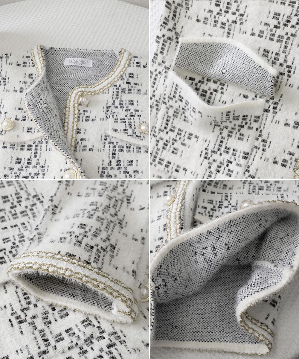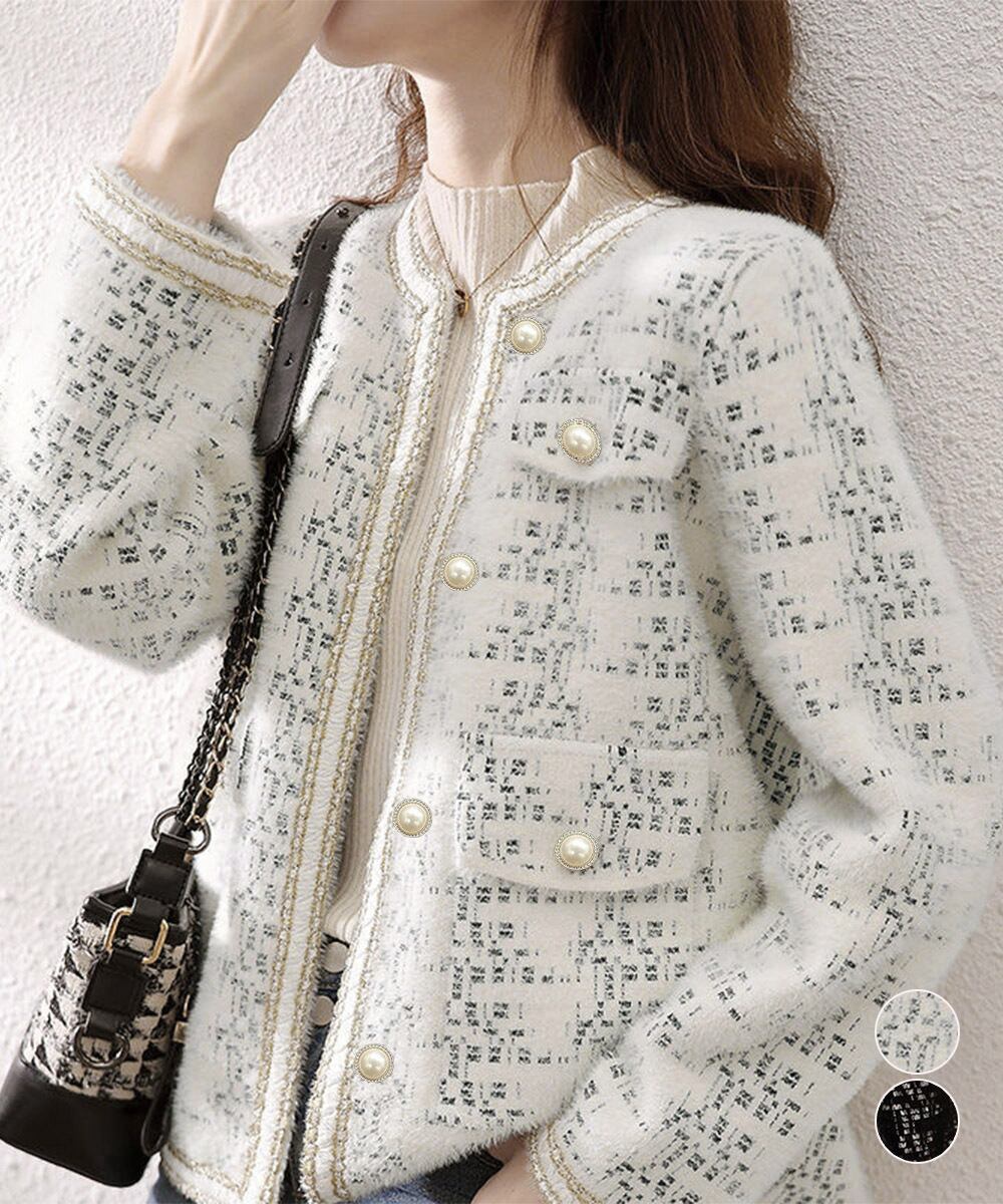 【日本倉庫即納】 ツイード調ニット ジャケット ノーカラー