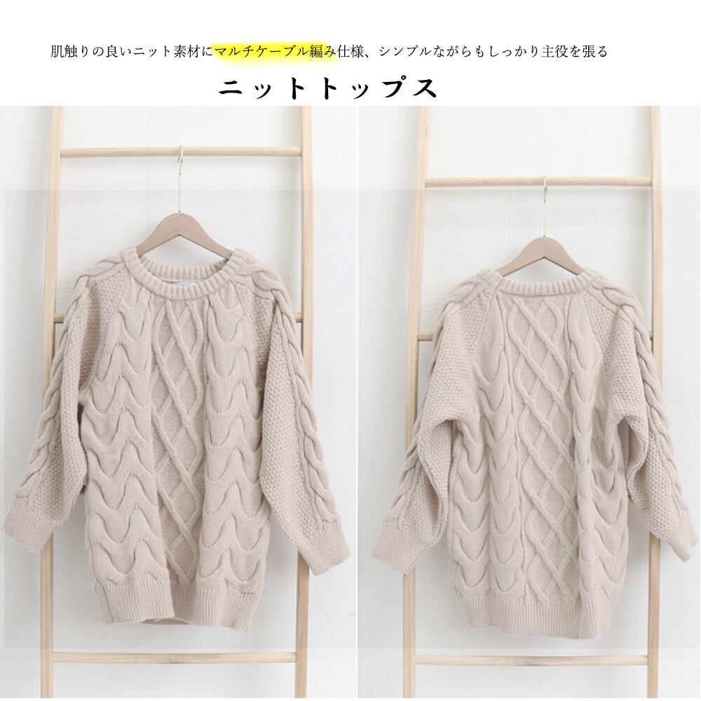 肌触りの良いニット素材にマルチケーブル編み仕様、シンプルながらもしっかり主役を張るニットトップス