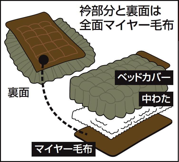 ●あったか3層構造/ベッドカバー・中綿・マイヤー毛布/ベッドカバーとマイヤー毛布の間に中綿を挟んだ3種構造で、ボリューム感があり保温力に優れています。
